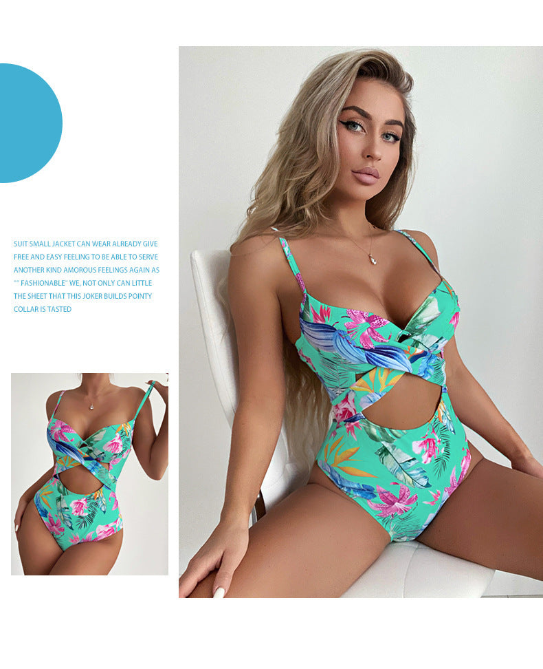 One-piece thin bikini with steel bracket in the bra, leaf print, crossover on the exposed belly, with open back straps