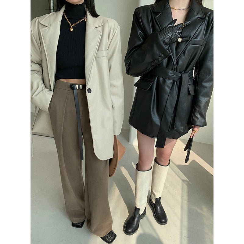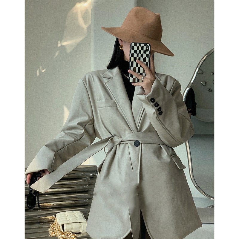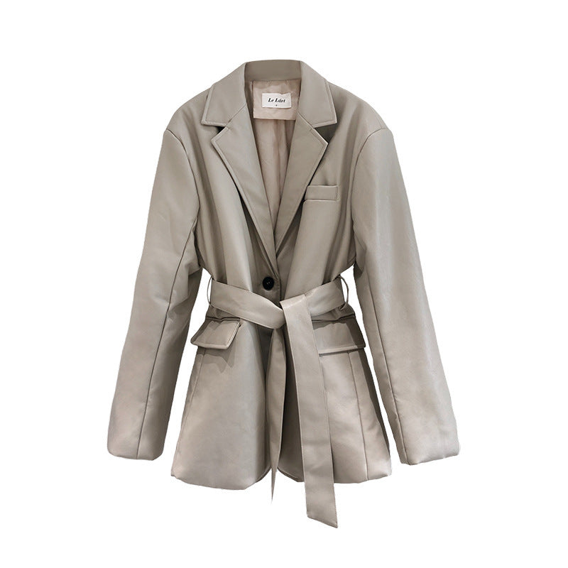 Cappotto lungo da donna di ecopelle, con cinturino, allacciatura con bottone e cinta, manica larga con bottoni
