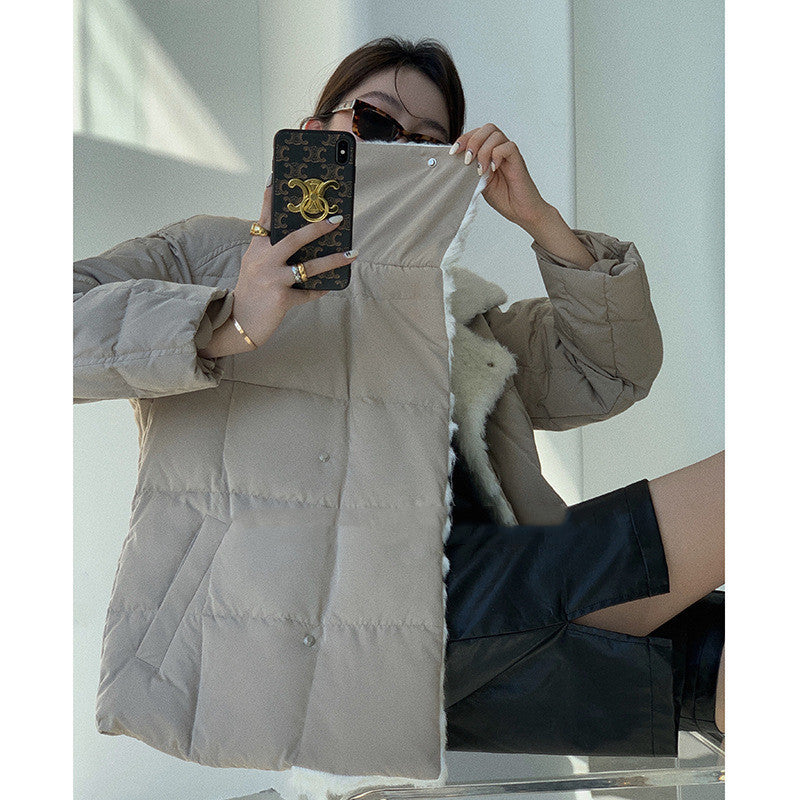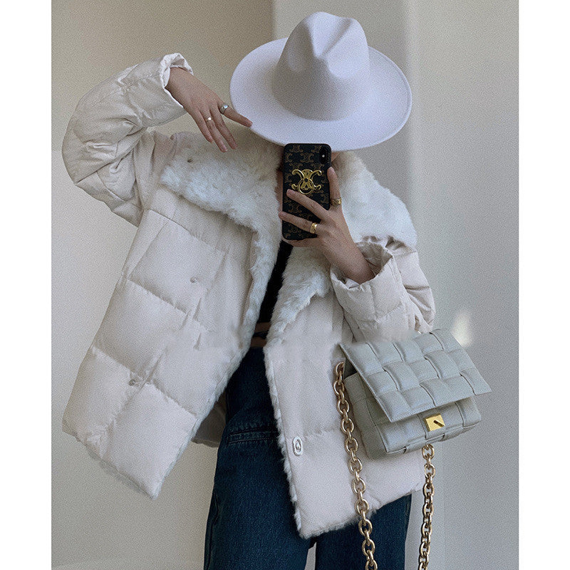 Piumino da donna con risvolto in lana con toppa, di media lunghezza, con piume d'anatra bianco