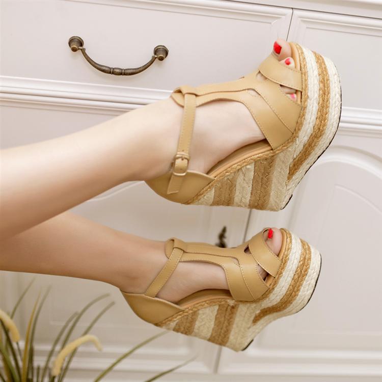 Striped Hemp High Wedge Sandals, Ankle Strap, Fish Mouth, Summer