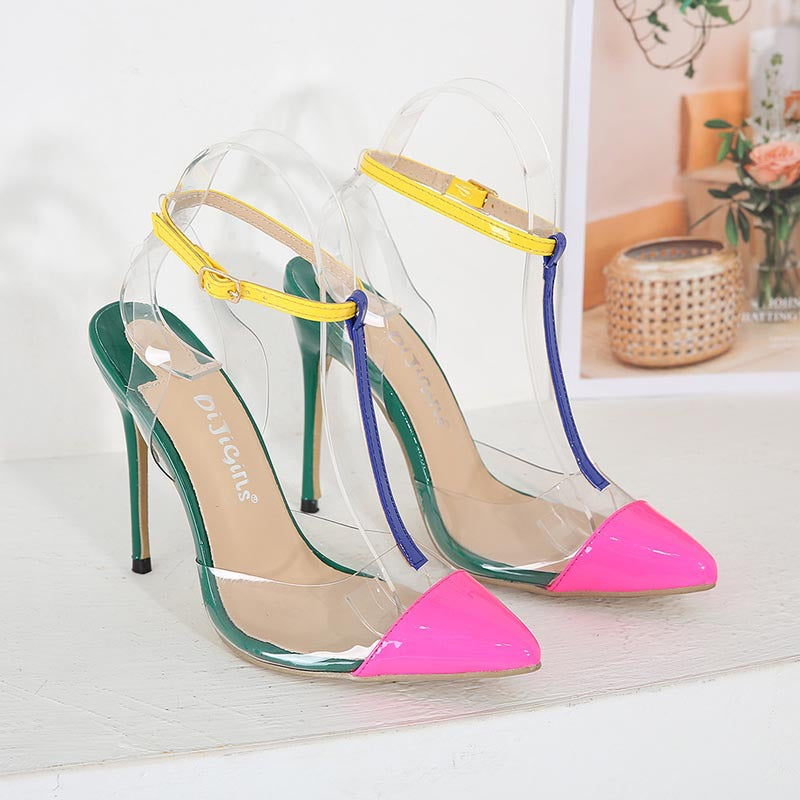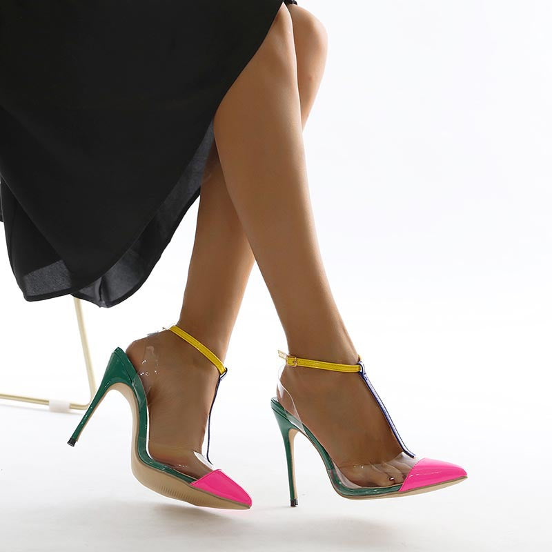 Elegant and sexy multicolored women's sandals with stiletto heel, bare foot effect