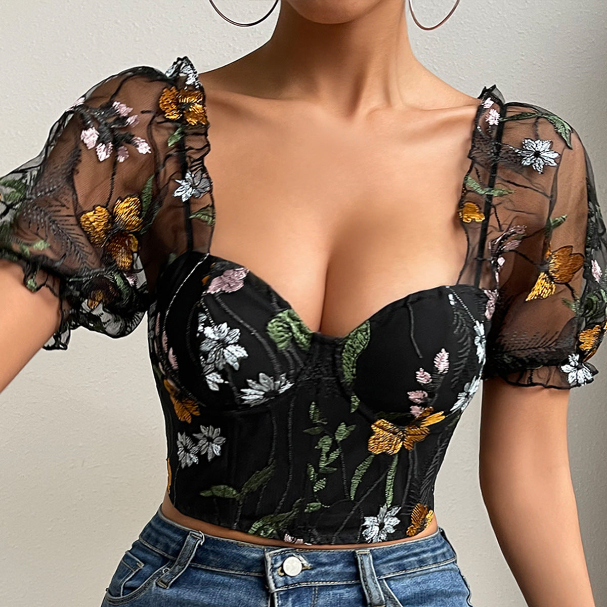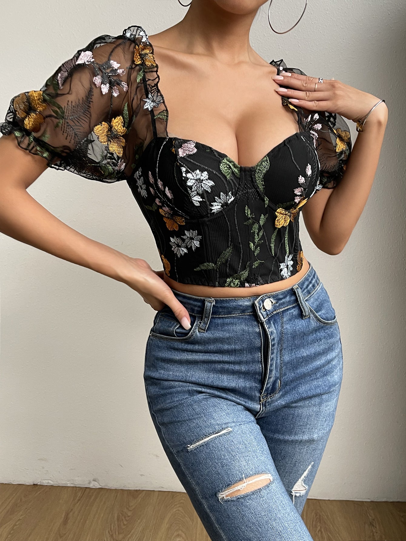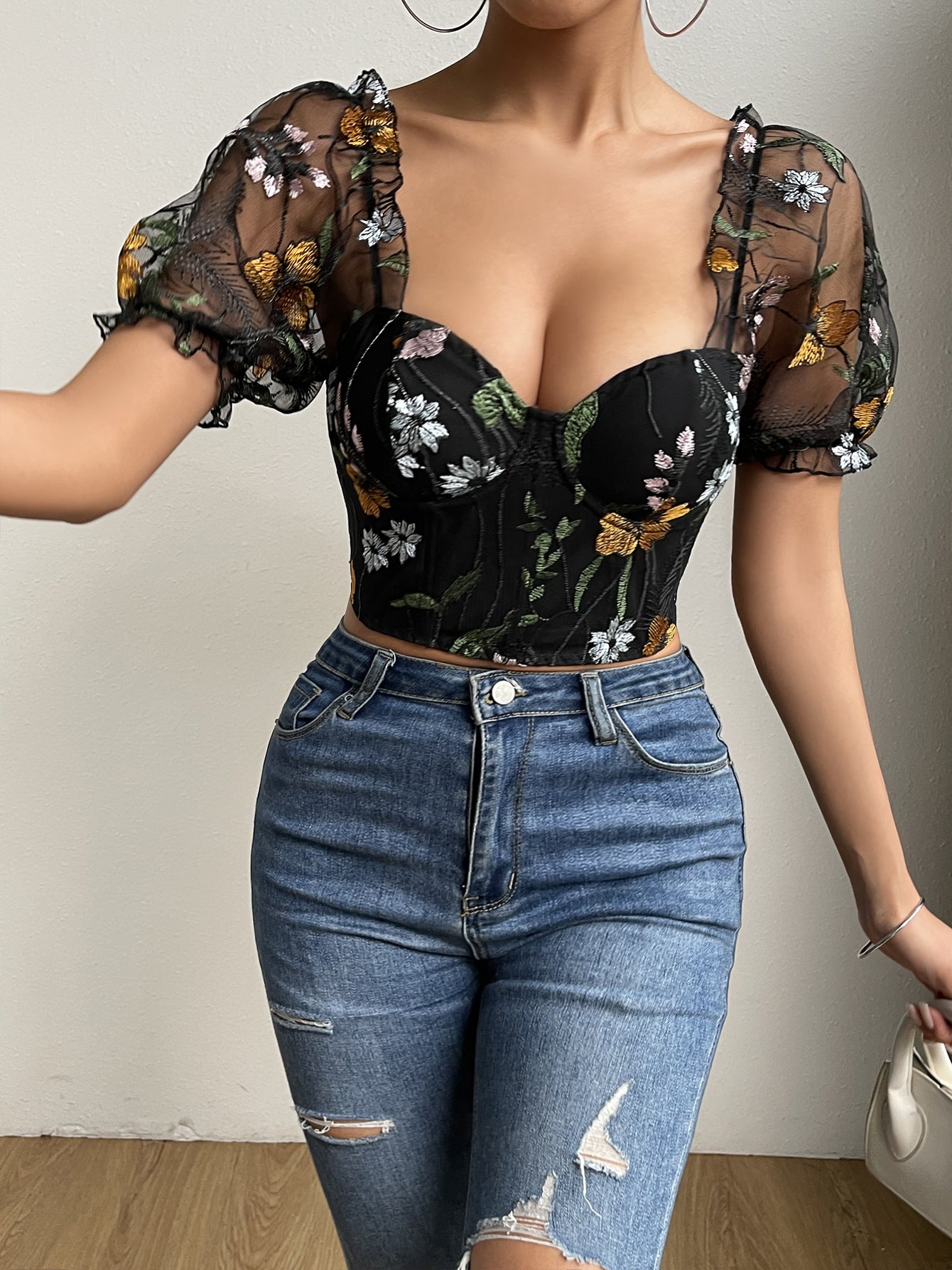 Floral embroidered mesh top with sheer chest and puff sleeve, cinched waist, casual and feminine