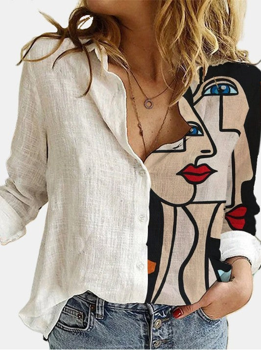 Camicia da donna con bottoni a manica lunga, con stampa digitale colletto rialzato patchwork