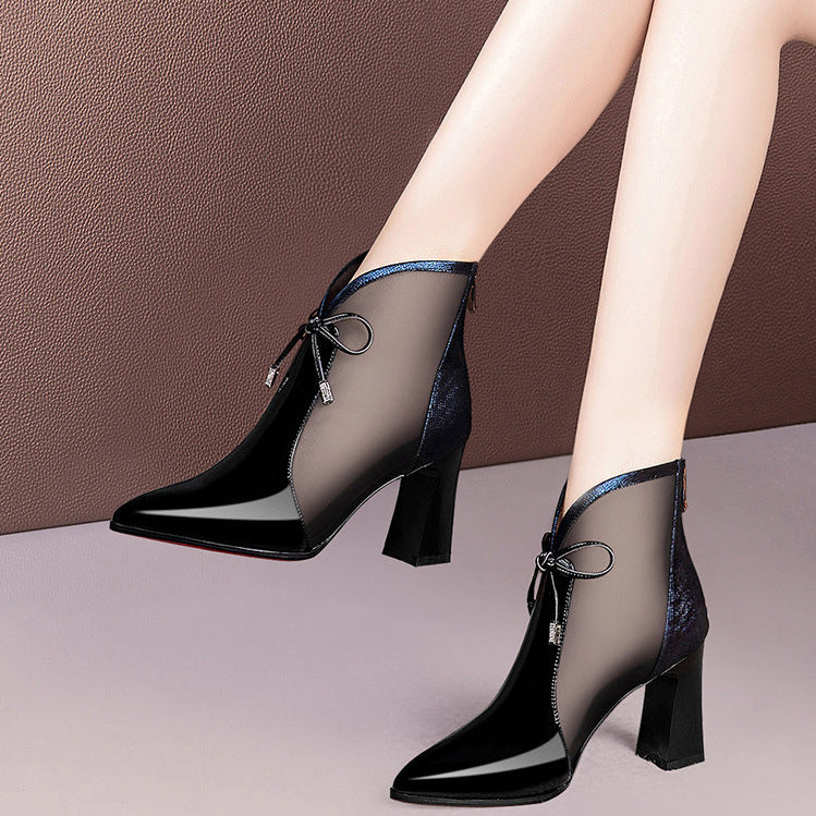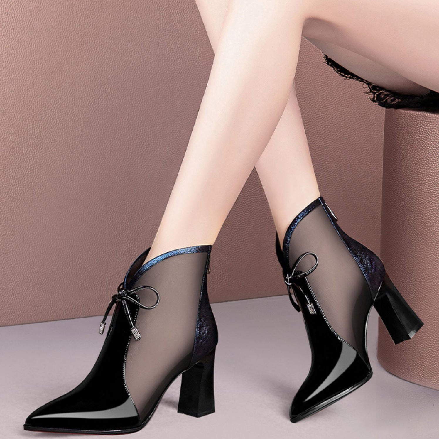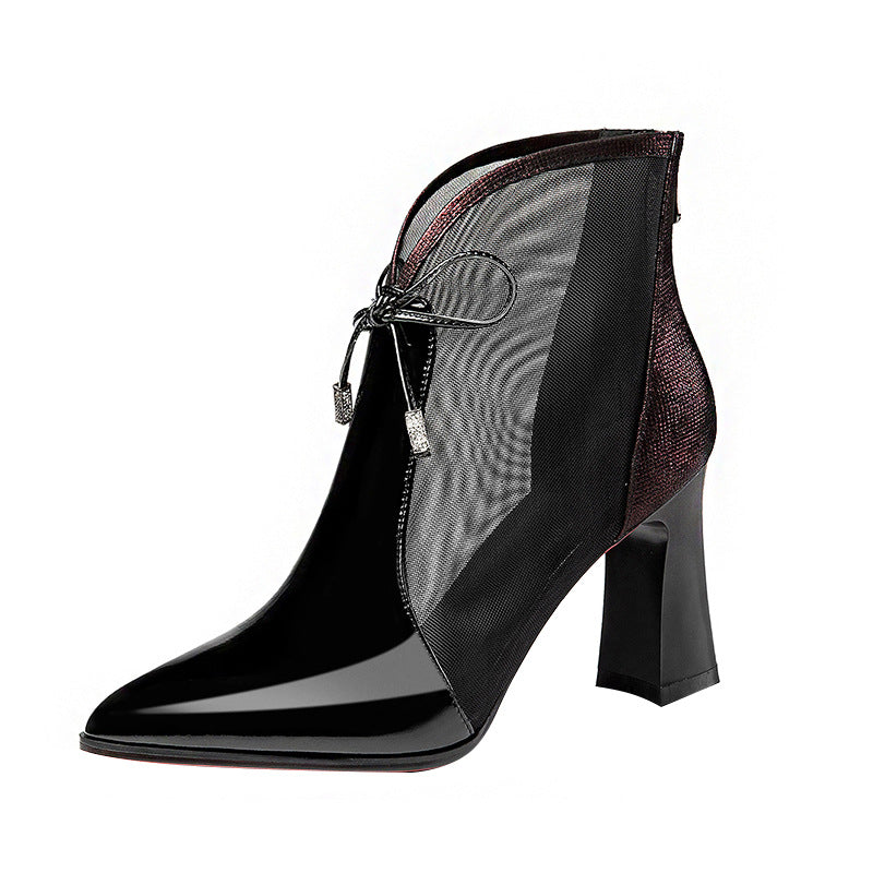 Women's ankle boots in shiny patent leather with mesh and wide heel