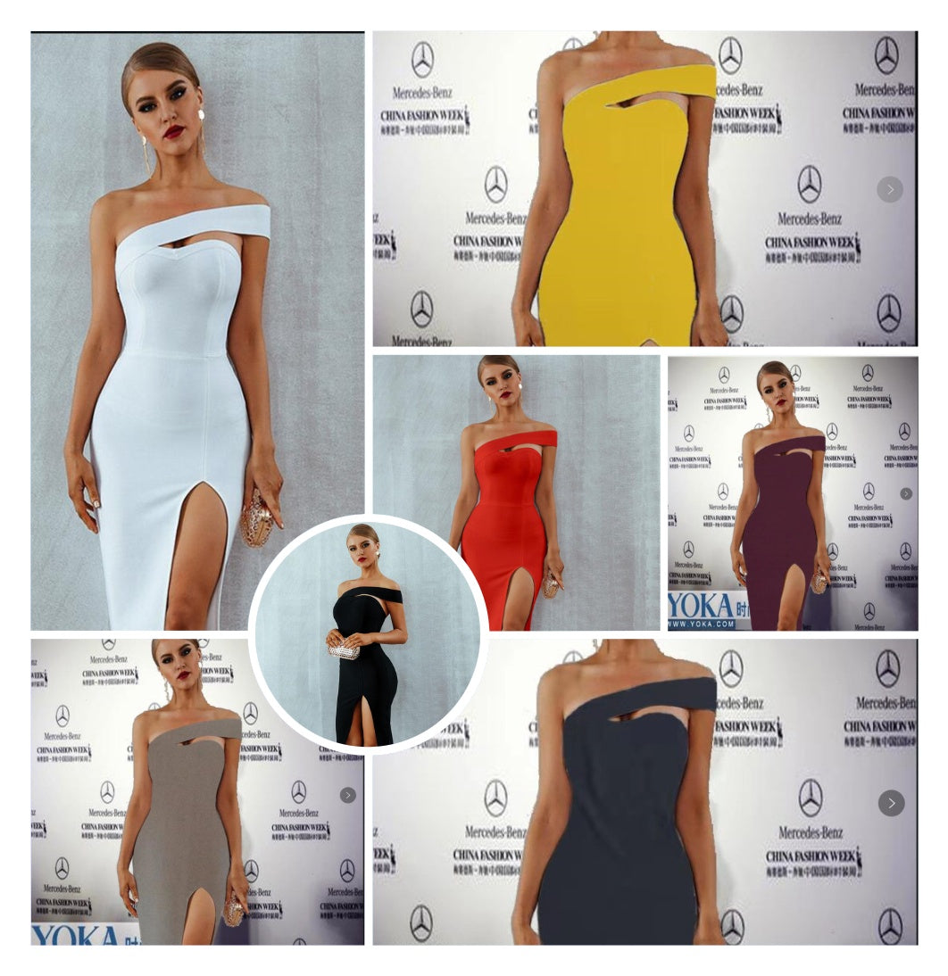 Long dress with off-the-shoulders strapless and thigh slit