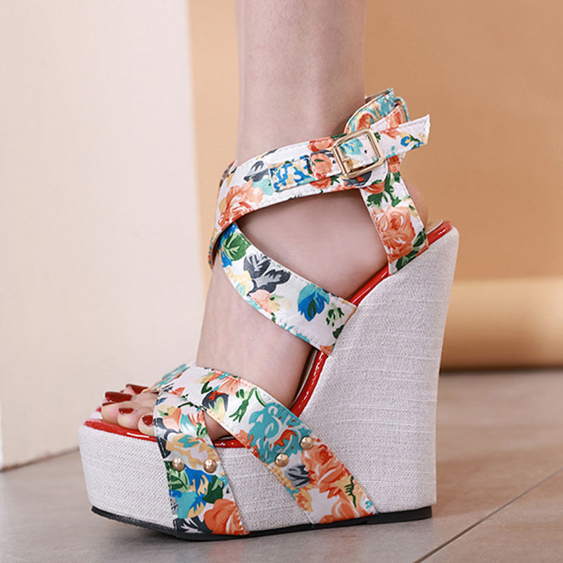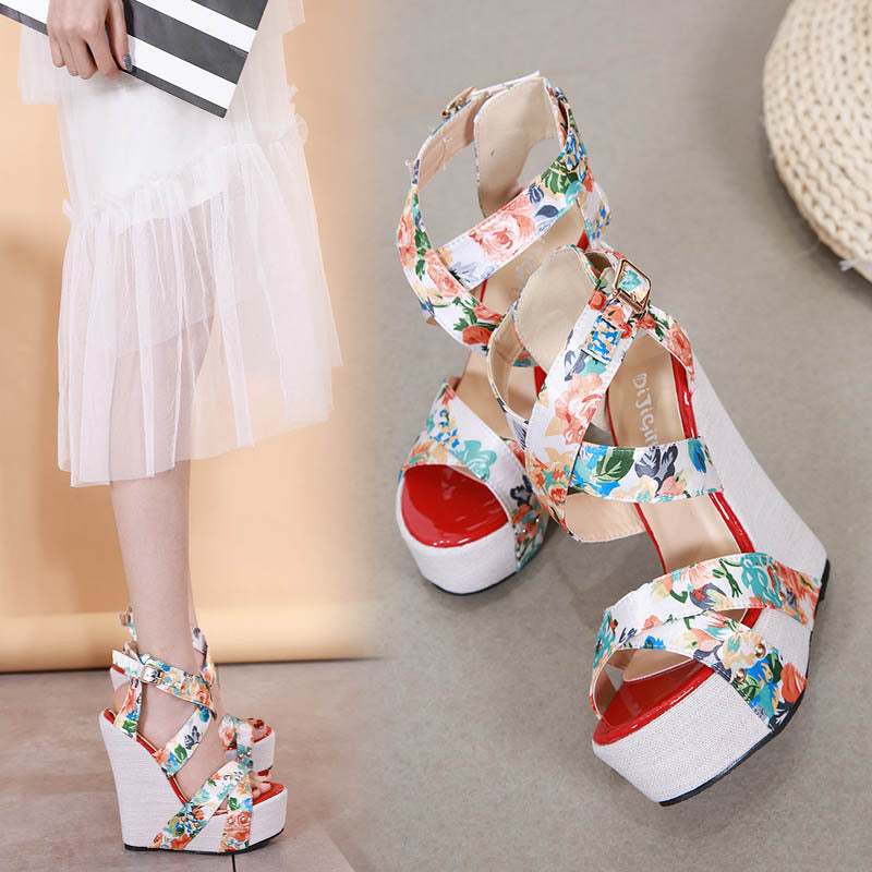 Women's wedge shoe, silk printed, with 15.5 cm high heel, 5 cm platform, woven fabric bands on the foot, spring summer