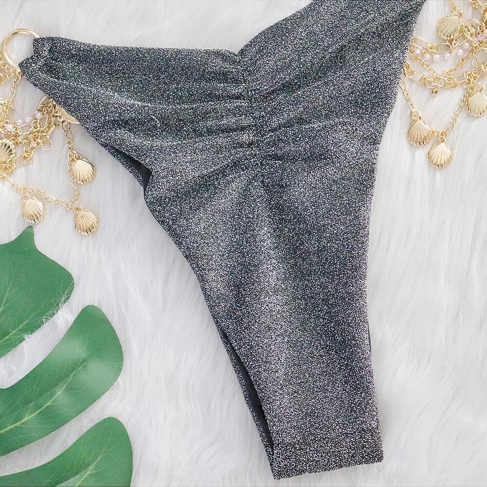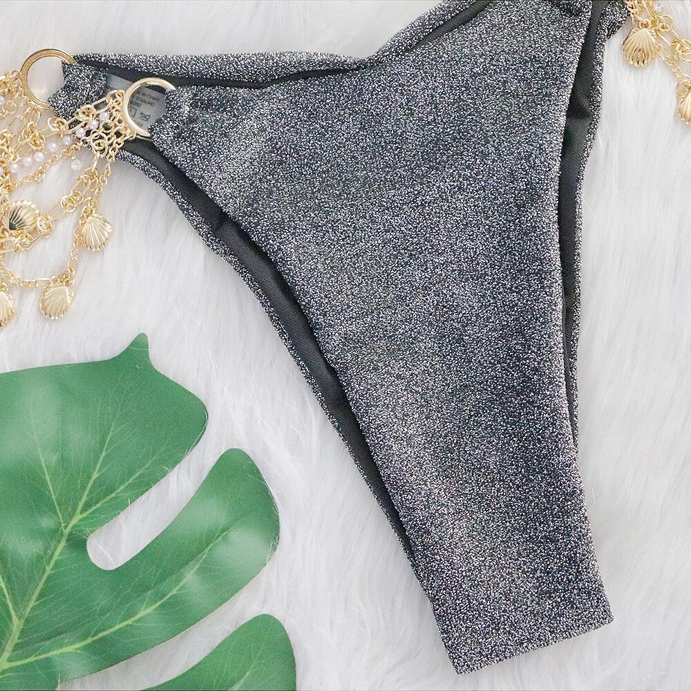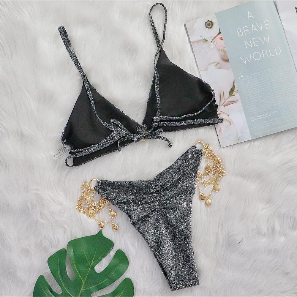 Bikini with panties finished with gold-colored metal chain and pearl and shell-shaped molds, very elegant and sexy
